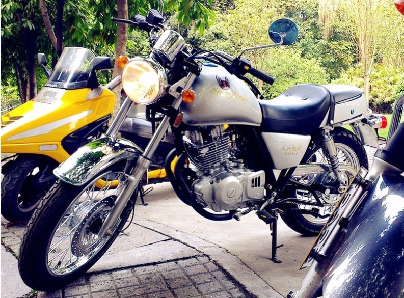却在拐角处停下了脚步,为何?只见花坛边停着一辆,似曾相识、闪闪发亮、很有腔调的复古车,哇塞,猪啊!这不是在论坛上曾有网友提起过,津沙之前一直在酝酿的铃木猪吗,没想到真的上市啦。哎呀,太TM有味道了,就在此时,本楼主承认已经中了二师兄的毒了!也不管此时此猪主人是否介意,先让本屌丝翻身上猪一试,恩,舒服,此猪正合本屌丝身材(不好意思,对于本屌丝的身材,请各位看官嘴下留情),身体略微前倾,双脚掌刚好着地,车头单速度表,内有转向灯及空挡指示,还有一小块液晶屏,往下细看,经典的GN250发动机,前后钢丝辐条轮圈,玻璃面大灯,侧盖上书:天地游侠GN250-C。。。此时此刻楼主已被此猪完全征服!